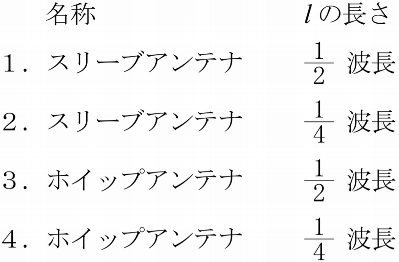 図に示すアンテナの名称と l の長さの組合せで、正しいのは次のうちどれか。